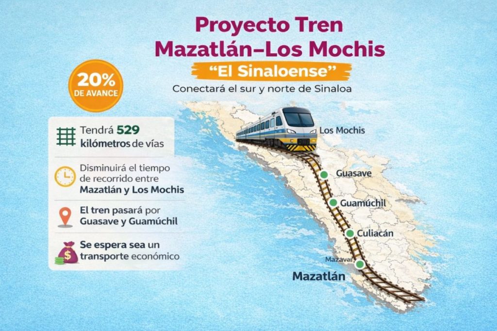 El tren Mazatlán–Los Mochis registra 20% de avance; recorrerá 529 km, combinará vía existente y nuevo trazo, y busca impulsar la conectividad y desarrollo en Sinaloa. El general Ricardo Vallejo Suárez, comandante del Agrupamiento de Ingenieros “Felipe Ángeles”, dijo esta mañana que el proyecto ferroviario que conecta Mazatlán con Los Mochis, Sinaloa, registra un avance del …