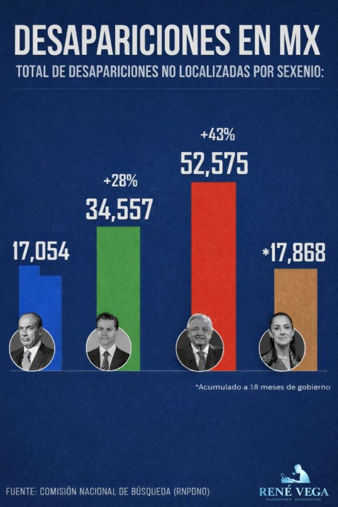 Aumentan desapariciones en México por sexenio El número de personas desaparecidas y no localizadas en México ha registrado un incremento sostenido en los últimos sexenios, de acuerdo con datos de la Comisión Nacional de Búsqueda. Durante el sexenio de Felipe Calderón se contabilizaron 17,054 casos, cifra que aumentó a 34,557 en la administración de Enrique …