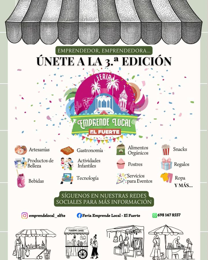 Invitación a la 3a. Edición de la Feria Emprende Local El Fuerte Sinaloa La Feria Emprende Local es un evento que busca impulsar a los emprendedores del municipio, darles visibilidad, generar más oportunidades de venta y seguir creando una comunidad donde todos podamos crecer En esta 3ª edición tendremos: Temática del Día del Niño Show …