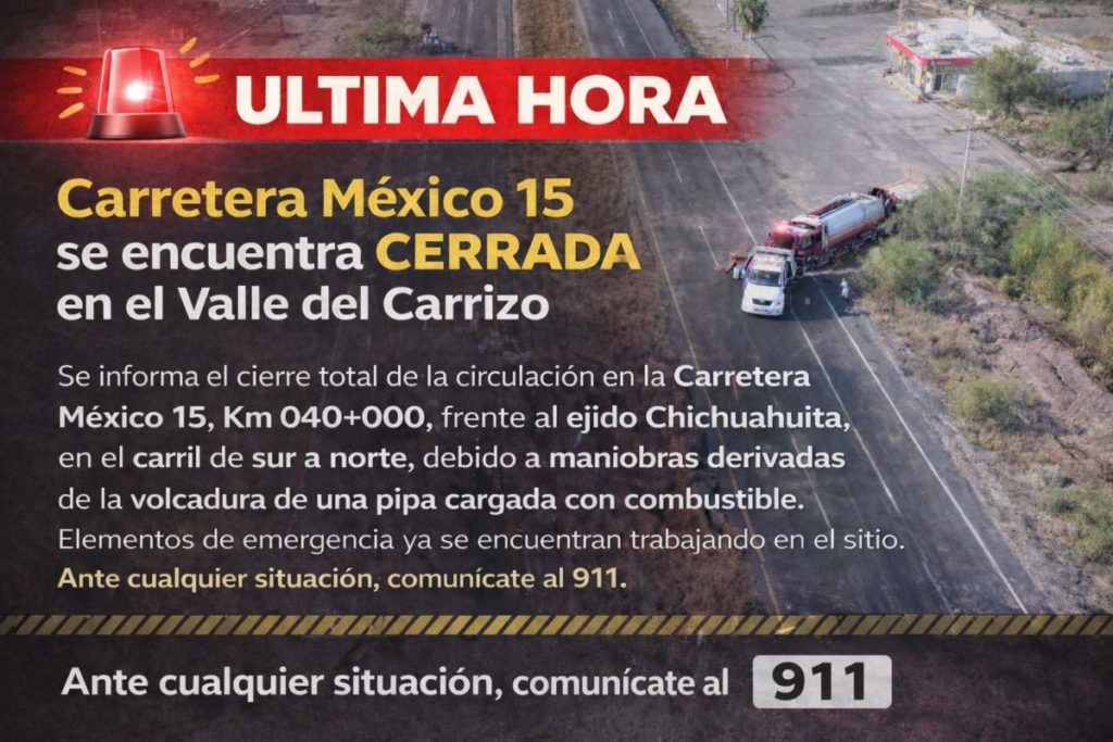 Vuelca pipa con amoniaco y provoca intoxicaciones en carretera Guaymas–Hermosillo Guaymas, Sonora. — Una situación de alto riesgo se registró este día en la carretera Guaymas–Hermosillo, luego de que una pipa cargada con amoniaco se volcara a la altura del kilómetro 164, provocando el cierre total de la circulación en ambos sentidos y activando un …