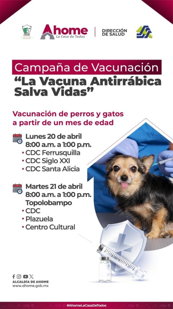 Campaña de Vacunación Antirrábica en Ahome Con el objetivo de proteger la salud de las familias y sus mascotas, el Ayuntamiento de Ahome, a través de la Dirección de Salud, llevará a cabo la campaña “La Vacuna Antirrábica Salva Vidas”, dirigida a perros y gatos a partir de un mes de edad. La jornada se …