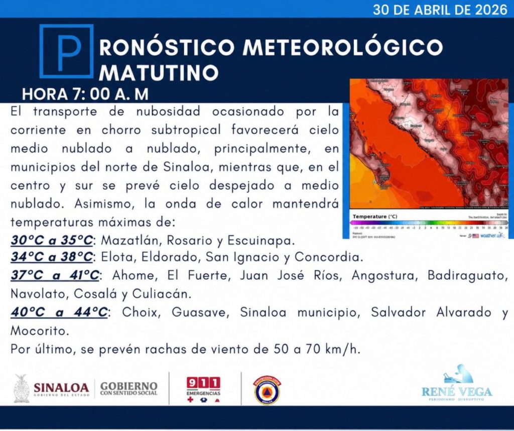 Pronóstico meteorológico de hoy jueves 30 de abril. Durante este día se prevén condiciones de cielo medio nublado con temperaturas máximas de 40°C a 44°C. Además, en el transcurso de la tarde se prevén rachas de viento de 50 a 70 km/h.
