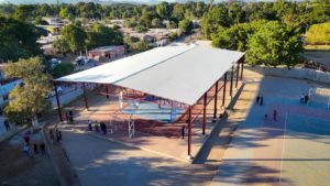 Alcalde Gildardo Leyva entrega techumbre metálica en la Unidad Deportiva de Mochicahui.