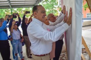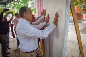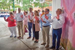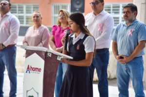 Durante la ceremonia, autoridades municipales, educativas y alumnos colocaron sus huellas en color rosa sobre un mural conmemorativo, símbolo de esperanza y unidad hacia las mujeres que enfrentan esta enfermedad.