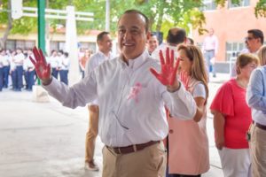 *El alcalde de Ahome encabezó el evento “Octubre Rosa, en nuestras manos”, acto conmemorativo en la Secundaria SNTE 1 Sección 53 Matutina, donde autoridades y estudiantes plasmaron sus huellas rosas como símbolo de esperanza y unidad en la prevención de esta enfermedad.-