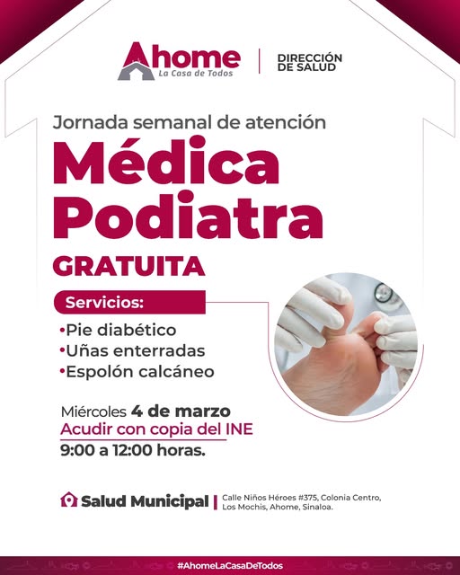 Jornada Semanal de Atención Médica Podíatra GRATUITA La Dirección de Salud de Ahome te invita a aprovechar este servicio sin costo. Servicios: • Pie diabético • Uñas enterradas • Espolón calcáneo Miércoles 4 de marzo 9:00 a 12:00 horas Acudir con copia del INE Calle Niños Héroes #375, Col. Centro, Los Mochis ¡Cuida la salud …