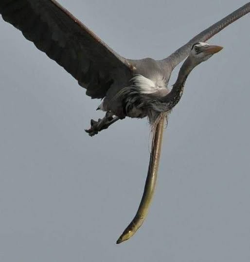 Un fotógrafo ha capturado el increíble momento en que una anguila ha intentado escapar del interior del estómago de una garza mientras el pájaro todavía estaba en vuelo.