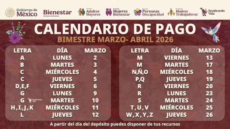 La Secretaría del Bienestar informó este lunes 2 de marzo de 2026 el calendario oficial de pagos de la Pensión Bienestar 2026 correspondiente al bimestre marzo-abril, detallando que los depósitos de 6,400 pesos comenzaron de manera escalonada en todo México conforme a la primera letra del apellido paterno de cada beneficiario, con el objetivo de organizar la dispersión y evitar saturaciones bancarias.