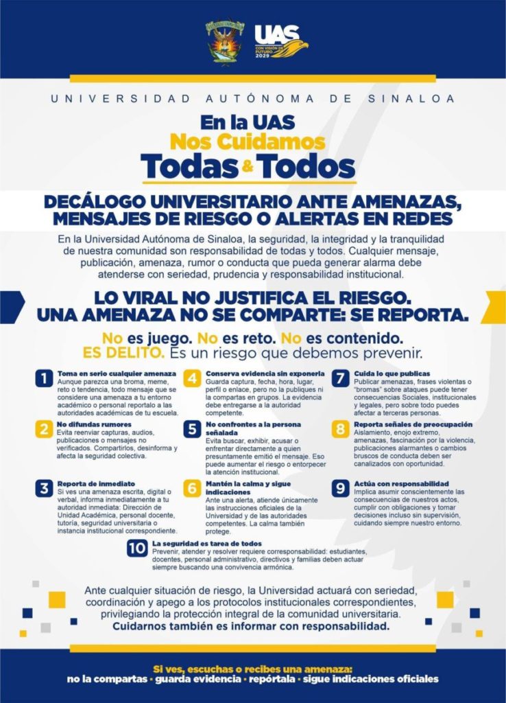 La Universidad Autónoma de Sinaloa activó este viernes los protocolos de seguridad en la Preparatoria Emiliano Zapata en Culiacán tras recibir una amenaza de bomba y tiroteo.