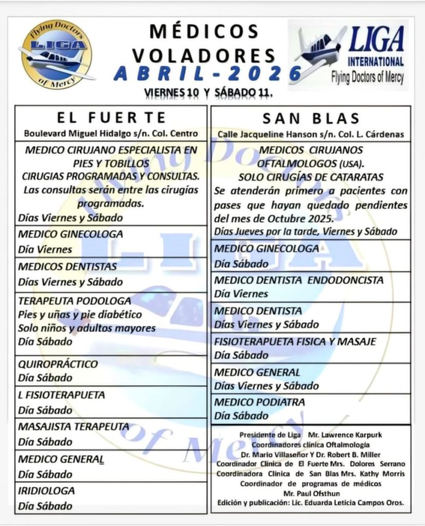 ¡Llegan los Médicos Voladores a El Fuerte y San Blas! El Ayuntamiento de El Fuerte, a través del Sistema DIF Municipal, invita a la ciudadanía a aprovechar los servicios médicos gratuitos que estarán disponibles este mes de abril de 2026, gracias al apoyo de Liga International – Flying Doctors of Mercy. 📅 Fechas de atención: …