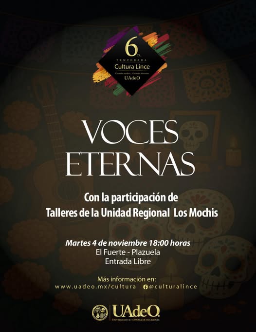 Invitación Especial La UAdeO te invita al evento “Voces Eternas”, con la participación de los Talleres de las Unidades Regionales de El Fuerte y Los Mochis; Martes 4 de noviembre, 18:00 h Plazuela de El Fuerte Ven y disfruta de una noche llena de arte, tradición y cultura.