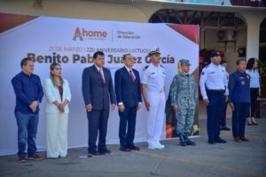 Los Mochis, Ahome, Sinaloa. A 21 de Marzo de 2026.- Para conmemorar el 220 aniversario del natalicio del Benemérito de las Américas, Benito Pablo Juárez García, autoridades gubernamentales, ciudadanos y organismos de las logias masónicas, se reunieron en acto cívico en palacio municipal donde izaron Bandera a toda asta, montaron guardia de honor y colocaron ofrenda floral.