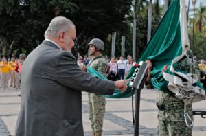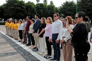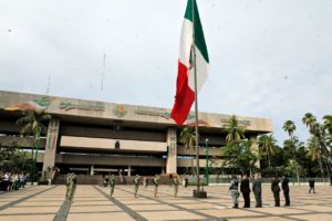 La ceremonia inició con el tradicional izamiento de bandera a toda asta en la plaza Cívica de Palacio de Gobierno, ceremonia que fue encabezada por el subsecretario de Inversión, Planeación y Finanzas, David Moreno Lizárraga, en representación del Poder Ejecutivo.