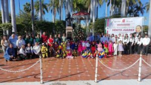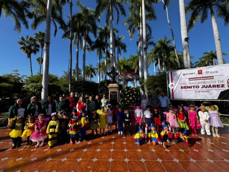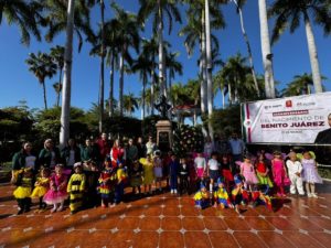 El H. Ayuntamiento de El Fuerte conmemoró el 220 aniversario del natalicio de Benito Juárez con un acto cívico realizado en el Hemiciclo a Benito Juárez, en la Plaza de Armas, el cual fue dirigido por el preescolar Miguel H. Ruelas.
