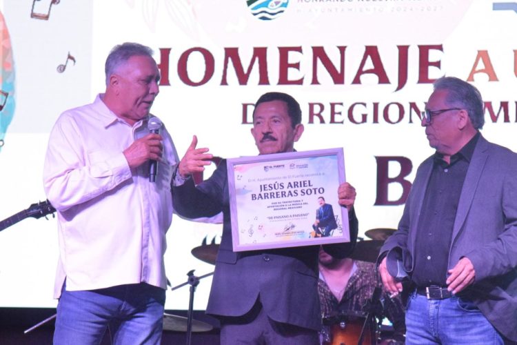 RENÉ VEGA: Periodismo Disruptivo. El Fuerte, Sinaloa, a 19 de noviembre de 2025.- En una emotiva velada llena de orgullo, el Ayuntamiento de El Fuerte rindió un merecido homenaje al reconocido cantautor Ariel Barreras, artista de raíces fortenses cuya obra ha dejado una huella profunda en la música regional mexicana. El evento se llevó a cabo en el marco de la Feria Tradicional El Fuerte 2025, ante la presencia de su familia, amigos y público que se dio cita para reconocer su legado.