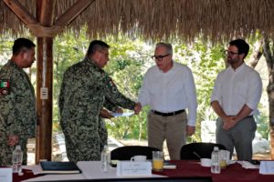 Para la entrega de este documento jurídico, el gobernador Rocha se hizo acompañar del director del Instituto Nacional del Suelo Sustentable (INSUS), José Alfonso Iracheta Caroll, y el acto formal tuvo lugar en las propias instalaciones del Cuartel General de Mando Especial de Badiraguato, en presencia también del comandante de la Novena Zona Militar, general de Brigada, Santos Gerardo Soto.