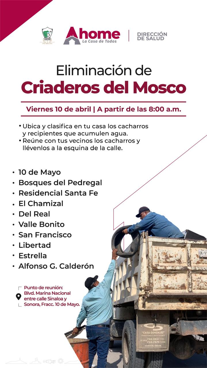 L os Mochis, Sinaloa, a 07 de abril de 2026.-El Ayuntamiento de Ahome, a través de la Dirección de Salud, anunció una jornada de eliminación de criaderos de mosco que se llevará a cabo el próximo viernes 10 de abril a partir de las 8:00 de la mañana.