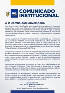 La Universidad Autónoma de Sinaloa estará informando a su comunidad de manera puntual y por los canales oficiales los avances que tengan respecto a las gestiones que mantiene el Rector Madueña Molina, en busca de generar certidumbre a los miles de trabajadores rosalinos en este cierre de año.