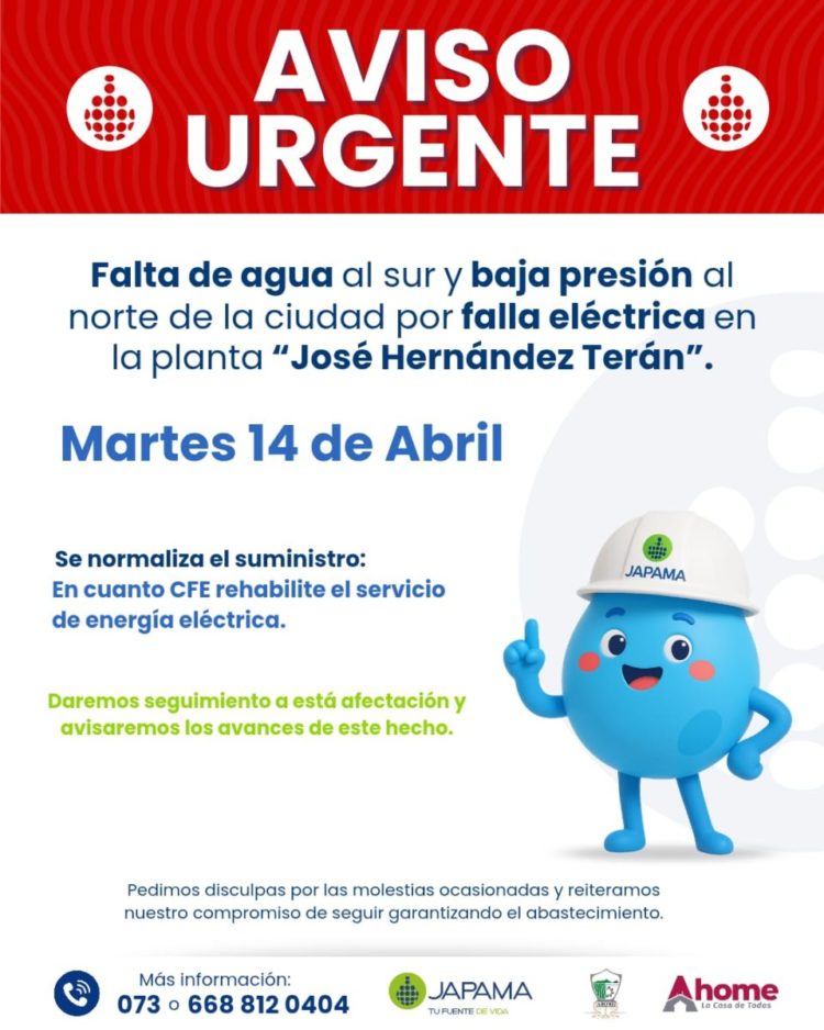 Que debido a una falla eléctrica, la planta potabilizadora “José Hernández Terán” se encuentra fuera de operación, lo que ocasiona falta de agua en la zona sur y baja presión en la zona norte de la ciudad.