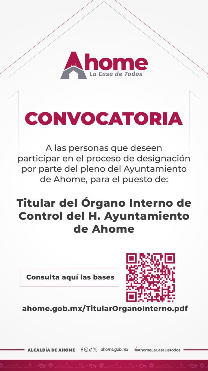 Las bases de la convocatoria están disponibles en las plataformas digitales de la Alcaldía de Ahome, en la liga www.ahome.gob.mx/TitularOrganointerno.pdf, y la recepción de los expedientes de las personas que deseen participar se realizará los días 6, 9 y 10 de febrero de 2026, en un horario de las 08:00 a 15:00 horas, con excepción del día sábado 7 cuyo horario de recepción será de 9:00 a 13:00 horas, en el despacho de la Síndica Procuradora del Ayuntamiento de Ahome, planta alta de Ayuntamiento de Ahome, por escrito dirigido a la titular de dicha oficina María Luisa Gómez Lizárraga.