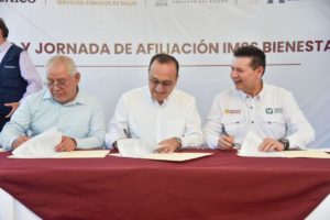 Durante la Firma de Convenio de la Jornada de Afiliación IMSS-Bienestar, donde se entregaron los primeros registros, el Coordinador Estatal resaltó el apoyo y atención del Alcalde hacia el sector salud.-