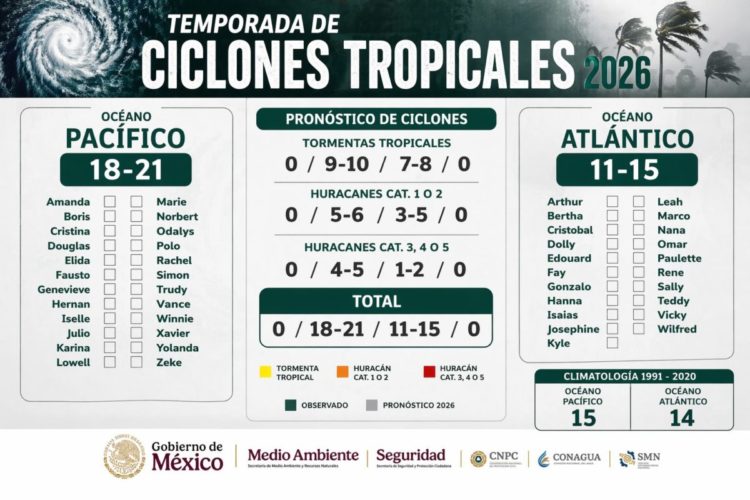 El SMN también difundió las listas oficiales de nombres que se asignarán a los ciclones en 2026.