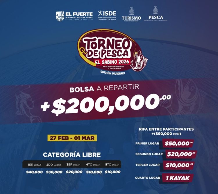El Fuerte, Sinaloa, a 26 de febrero del 2026.- El Gobierno Municipal, a través es de la Dirección de Pesca, informa que todo se encuentra listo para la realización del Torneo de Pesca El Sabino 2026, uno de los eventos deportivos más esperados de la región, que se llevará a cabo en la presa Presa Josefa Ortiz de Domínguez, del 27 de febrero al 01 de Marzo, llevándose a cabo la inauguración el día viernes 27 de febrero a las 17:00 horas.