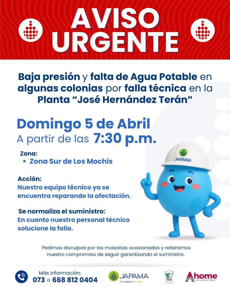 Se informa que debido a una falla técnica en la planta potabilizadora José Hernández Terán, se presenta baja presión y en algunos casos falta de agua en la zona sur de Los Mochis.